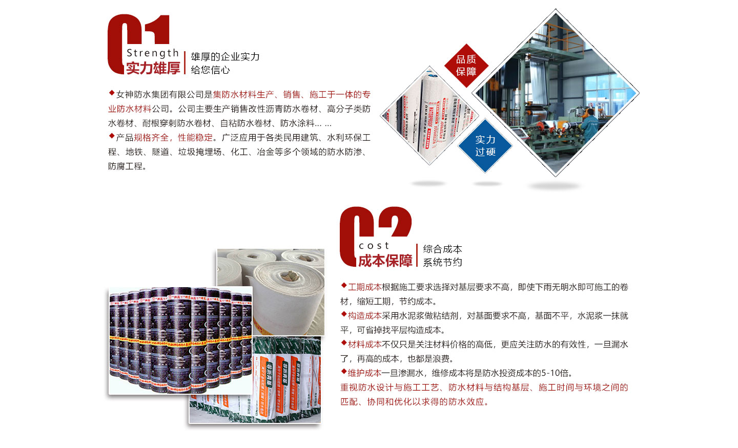 安徽女神建材科技集團有限公司是集防水材料研發(fā)、生產、銷售、施工為一體的綜合性防水材料集團公司。我公司旗下有多條大型一次成型生產線:SBS改性瀝青防水卷材,DTM聚酯復合高分子防水卷材,非瀝青基高分子防水卷材,PVC,TPO高分子防水卷材等生產線。我公司秉承“創(chuàng)新發(fā)展、實惠用戶”為宗旨,確保生產材料基礎上推出“共享生產廠家”,為開發(fā)商、建筑商節(jié)約成本為理念,新理念受到用戶企業集采時一致好評和認可。在互聯網時代,我公司將以互聯網“共享”為發(fā)展理念,為開發(fā)商、建筑商、防水企業提供的產品,真正讓用戶企業達到巨大...